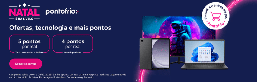 Ponto Frio: 5 pontos por real gasto nas categorias de telas, informática e tablets; 4 pontos por real nos demais produtos vendidos e entregues por Pontofrio e 1 ponto por real para marketplace mediante pagamento via cartão de crédito, boleto e Pix.