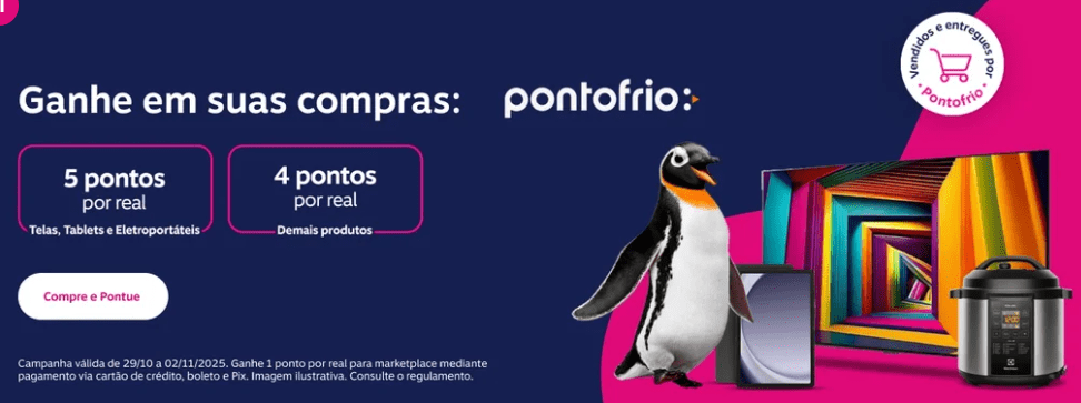 Ponto Frio: 5 pontos por real gasto nas categorias de telas, tablets e eletroportáteis; 4 pontos por real nos demais produtos vendidos e entregues por Pontofrio e 1 ponto por real para marketplace mediante pagamento via cartão de crédito, boleto e Pix.