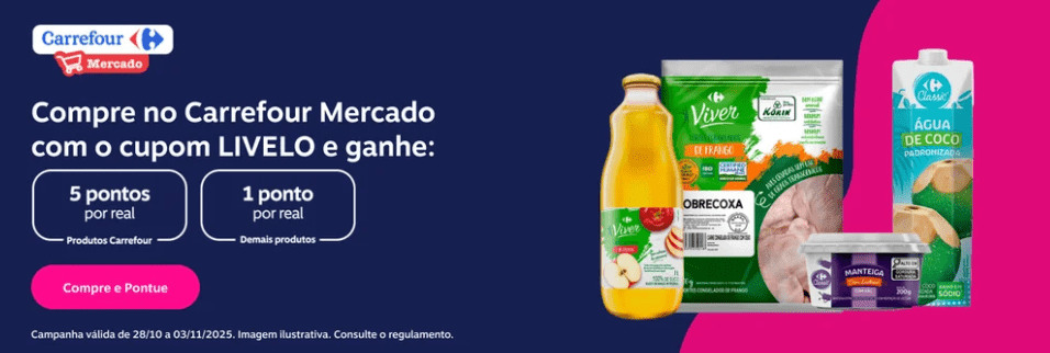 Carrefour: 5 pontos por real gasto em produtos Carrefour e 1 ponto por real nos demais itens.