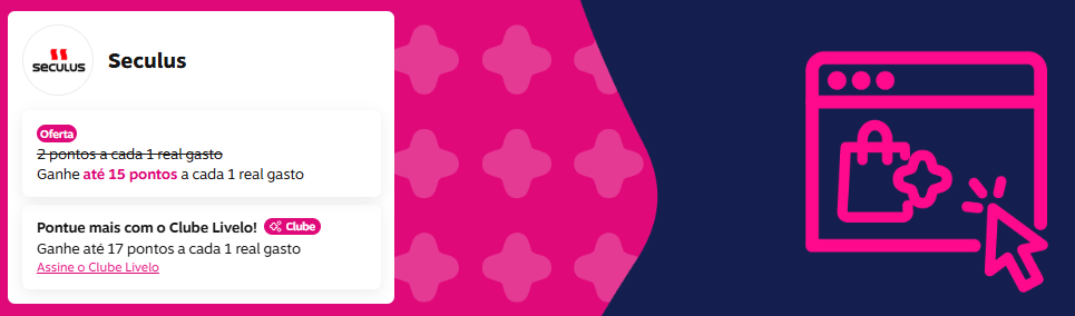 Seculus: 17 pontos por real gasto em produtos selecionados exclusivo para assinantes Clube Livelo; 15 pontos por real para demais clientes na lista selecionada e 2 pontos por real nos demais produtos.