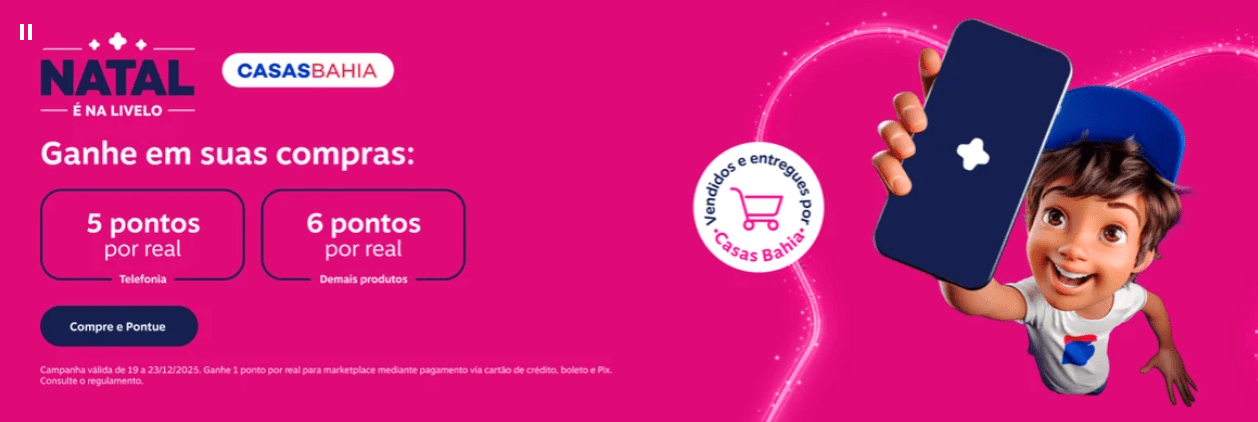 Casas Bahia: 5 pontos por real gasto na categoria de telefonia; 6 pontos por real gasto nos demais produtos vendidos e entregues por Casas Bahia e 1 ponto por real para marketplace mediante pagamento via cartão de crédito, boleto e Pix.
