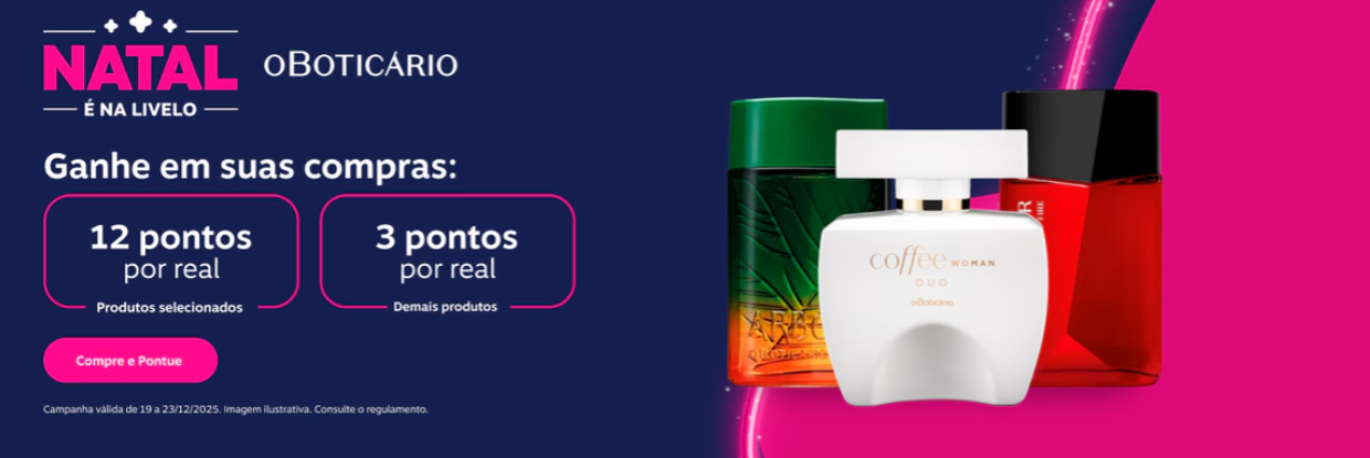 O Boticário: 12 pontos por real gasto em produtos selecionados e 3 pontos por real nos demais itens.