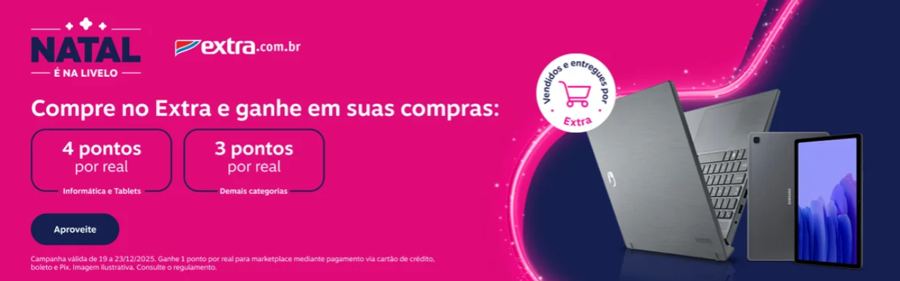 Extra: 4 pontos por real gasto nas categorias de informática e tablets; 3 pontos por real para demais produtos vendidos e entregues por Extra e 1 ponto por real para marketplace mediante pagamento via cartão de crédito, boleto e Pix.