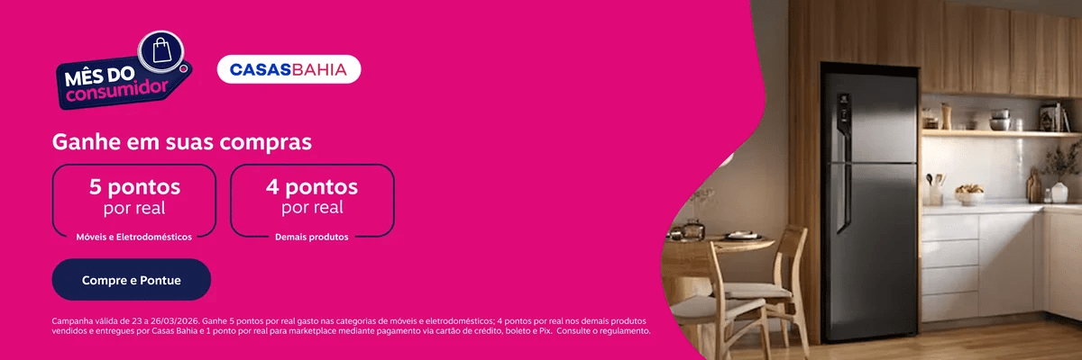 Casas Bahia: 5 pontos por real gasto nas categorias de móveis e eletrodomésticos; 4 pontos por real nos demais produtos vendidos e entregues por Casas Bahia e 1 ponto por real para marketplace mediante pagamento via cartão de crédito, boleto e Pix.