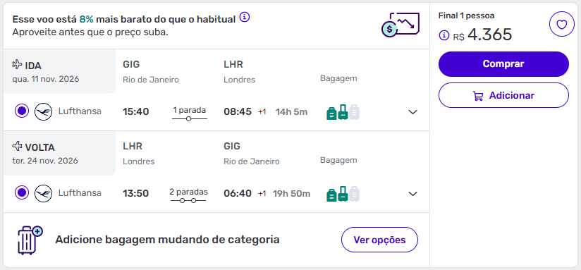Além do preço competitivo, algumas datas estão até 8% mais baratas que o habitual, o que pode indicar uma boa oportunidade para garantir a viagem.