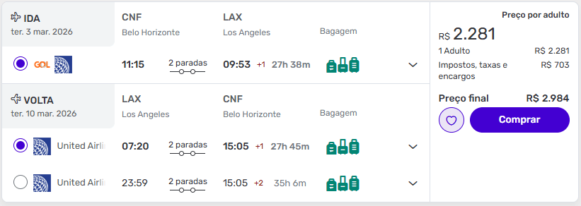 Todas as tarifas são de ida e volta com taxas inclusas e há opções com babagens inclusas.