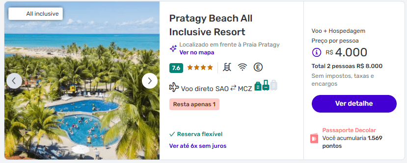 Agora, se o que você quer são dias de muito lazer e relaxamento, a Decolar também oferece promoções de pacotes em hospedagens all inclusive, como no Pratagy Beach All Inclusive Resort, na Praia da Sereia do Pratagy, em frente às piscinas naturais do Rio Mirim, com praia privativa, estacionamento, parque aquático, atividades recreativas durante o dia todo e um restaurante que serve pratos da culinária regional e internacional.