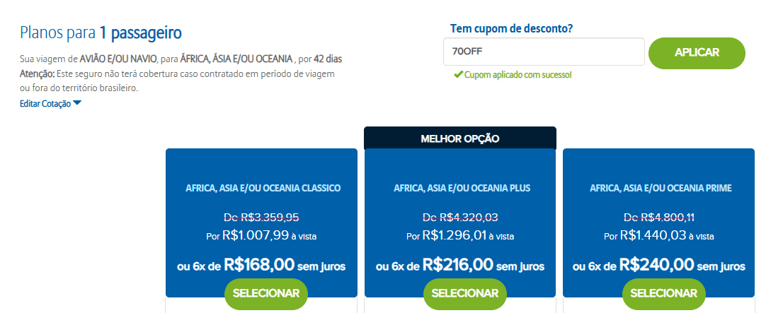 - “70OFF”: O viajante não precisará se preocupar em aplicar o cupom quando for finalizar a contratação do seguro. A aplicação é automática e feita pela própria Allianz.