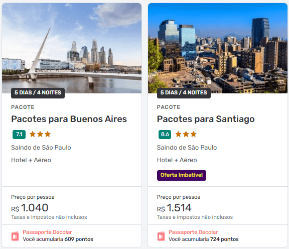 Para o exterior, há opções como passar 5 dias e 4 noites em um hotel 3 estrelas em Buenos Aires por preços a partir de R$ 1.040 ou em Santiago, pagando a partir de R$ 1.514.