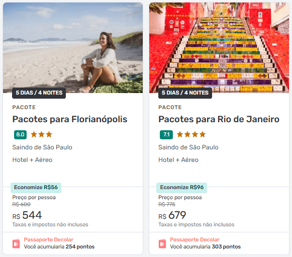 Há oportunidades de viajar com economia pagando a partir de R$ 544 por pessoa para ficar 5 dias e 4 noites em Florianópolis, ou no Rio de Janeiro, pagando a partir de R$ 679 (lembrando que os voos, partindo de São Paulo, estão inclusos no pacote de viagem).