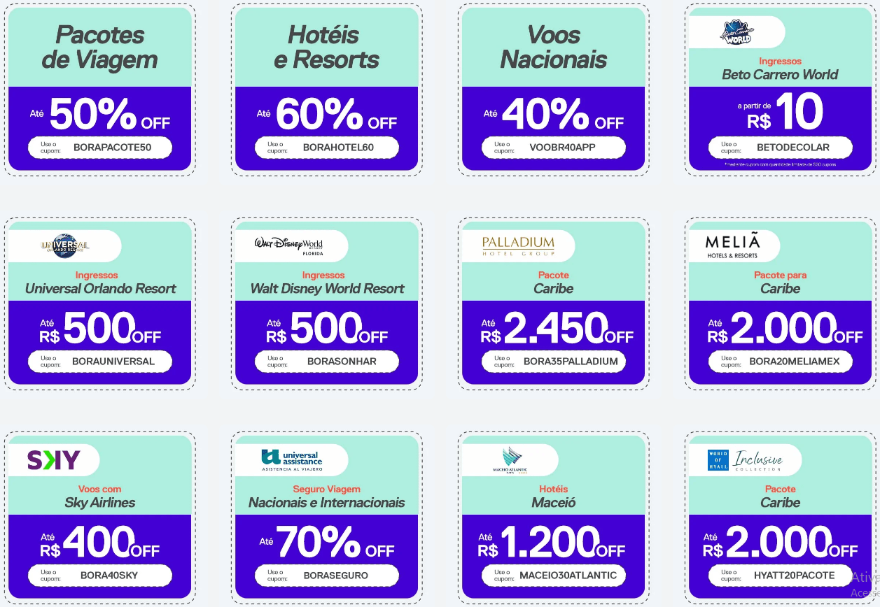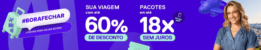 Ganhe até 50% OFF em pacotes usando o cupom: BORAPACOTE50, e até 60% OFF em hospedagens, com BORAHOTEL60.