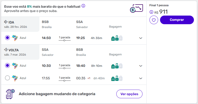 De Brasília para Salvador a partir de R$ 911 ida e volta com taxas.