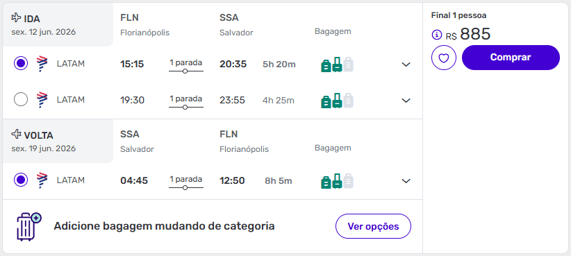 De Florianópolis para Salvador a partir de R$ 885 ida e volta com taxas.