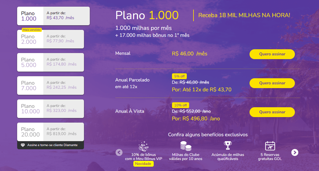 Além disso, o plano continua creditando 1.000 milhas por mês enquanto a assinatura estiver ativa.