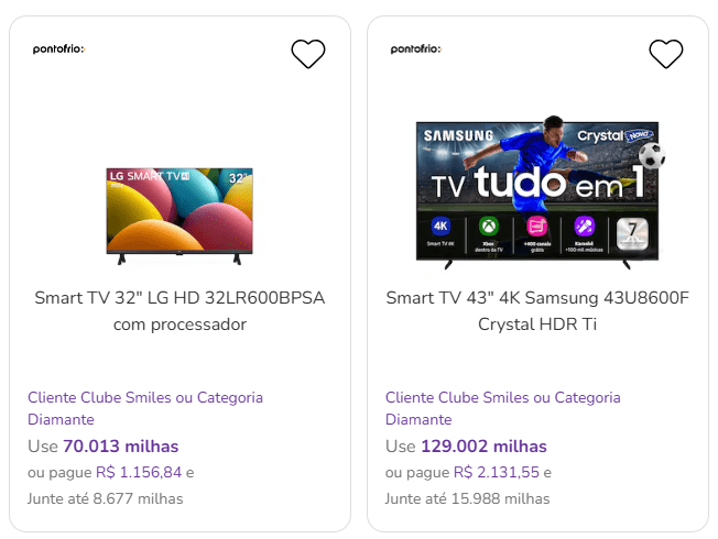 • Smart TV Samsung 43″ 4K Crystal HDR a partir de 129.002 milhas ou R$ 2.131,55 com acúmulo de até 15.988 milhas