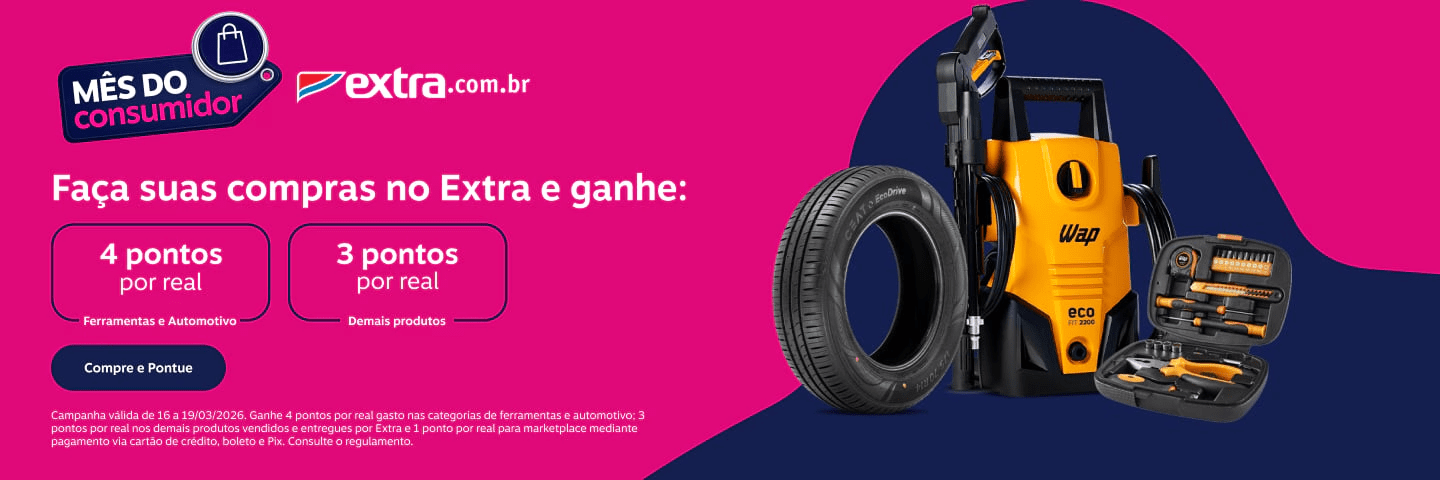 Extra: 4 pontos por real gasto nas categorias de ferramentas e automotivo; 3 pontos por real nos demais produtos vendidos e entregues por Extra e 1 ponto por real para marketplace mediante pagamento via cartão de crédito, boleto e Pix.