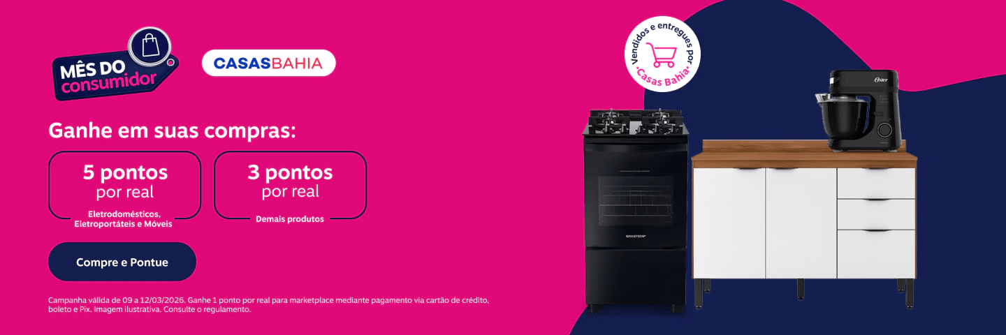 Casas Bahia: 5 pontos por real gasto nas categorias de eletrodomésticos, eletroportáteis e móveis; 3 pontos por real nos demais produtos vendidos e entregues por Casas Bahia e 1 ponto por real para marketplace mediante pagamento via cartão de crédito, boleto e Pix.