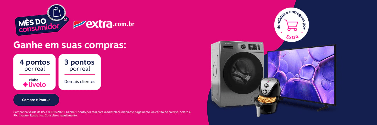 Extra: 4 pontos por real gasto exclusivo para assinantes Clube Livelo; 3 pontos por real para demais clientes em produtos vendidos e entregues por Extra e 1 ponto por real para marketplace mediante pagamento via cartão de crédito, boleto e Pix.