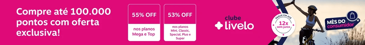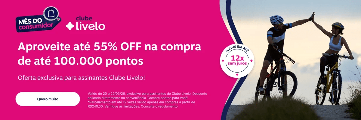 Entre os dias 20 e 22 de março de 2026, assinantes do Clube Livelo podem comprar pontos com até 55% de desconto, além de parcelamento e condições especiais que ampliam ainda mais o custo-benefício.