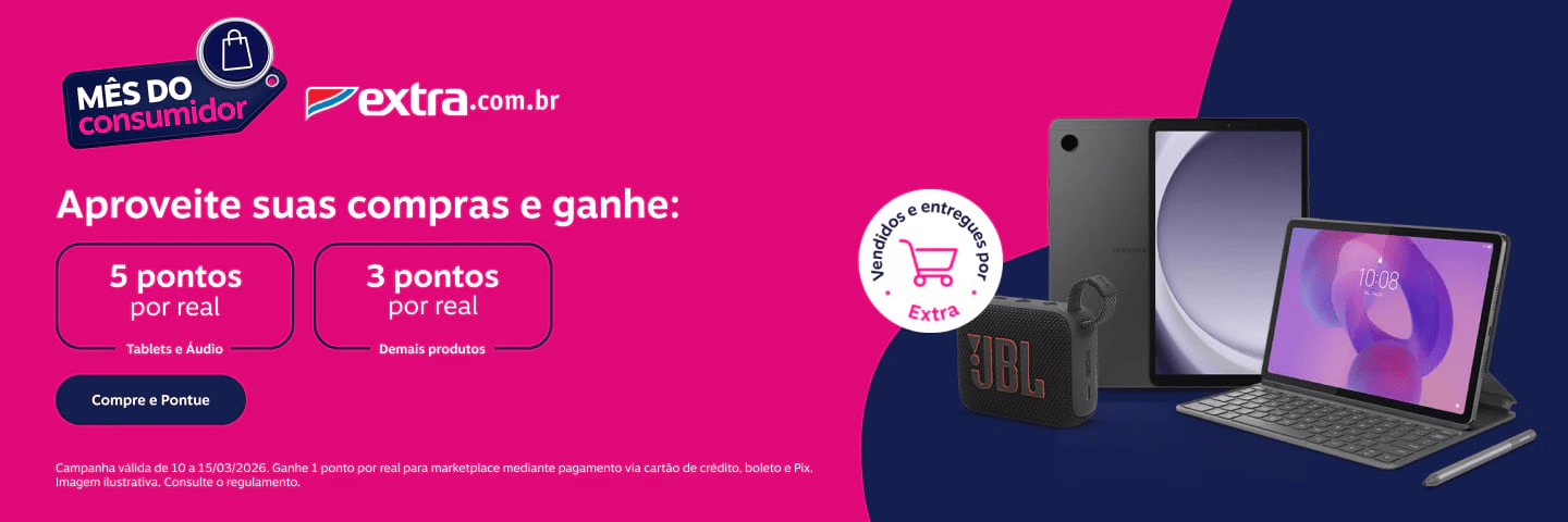 Extra: 5 pontos por real gasto em categorias dos tablets e áudio; 3 pontos por real nos demais produtos vendidos e entregues por Extra e 1 ponto por real para marketplace mediante pagamento via cartão de crédito, boleto e Pix.