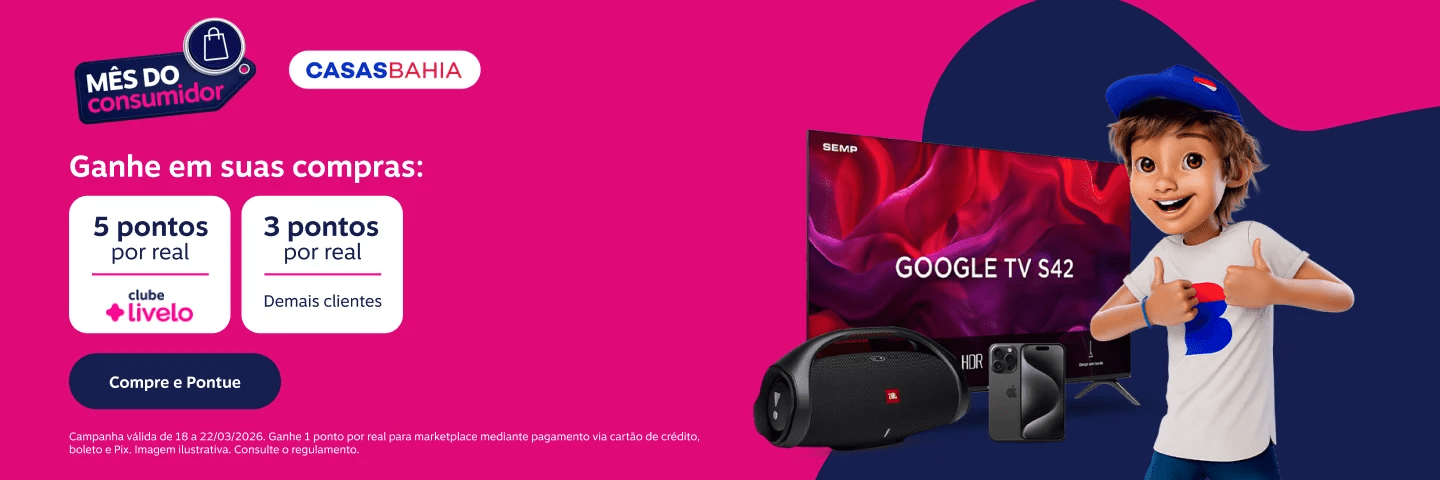 Casas Bahia: 5 pontos por real gasto exclusivo para assinantes Clube Livelo; 3 pontos por real para demais clientes em produtos vendidos e entregues por Casas Bahia e 1 ponto por real para marketplace mediante pagamento via cartão de crédito, boleto e Pix.