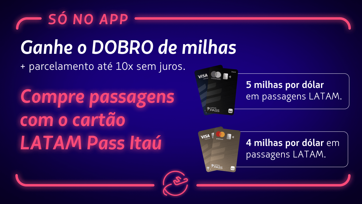 A LATAM lançou uma campanha especial de Black Friday que permite aos portadores dos cartões LATAM Pass Itaú acumularem milhas em dobro na compra de passagens aéreas. A ação é válida entre 27 e 30 de novembro de 2025, exclusivamente para compras feitas no site ou aplicativo da LATAM Airlines.