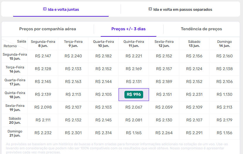 Faça sua busca e clique em “Preços +/- 3 dias” que um calendário com combinações de datas com as melhores ofertas irá se abrir.