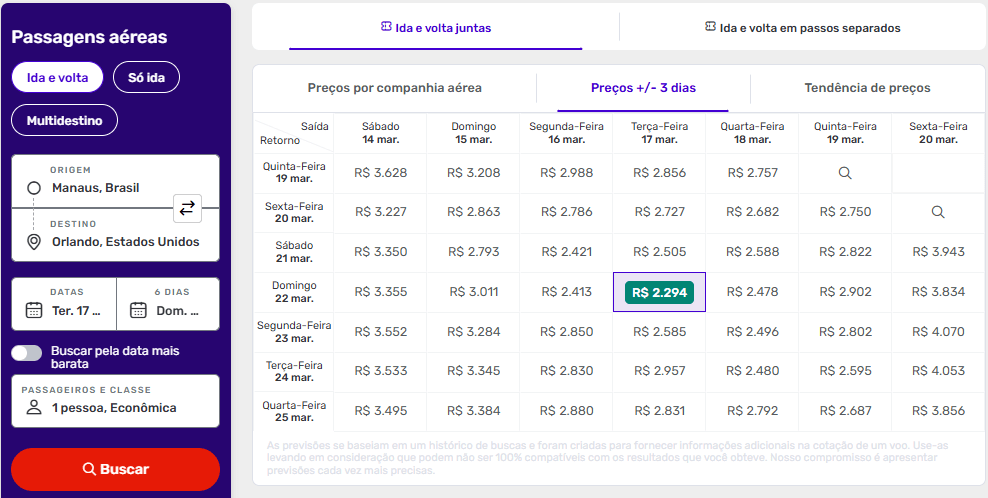 Faça sua busca e clique em “Preços +/- 3 dias” que um calendário com combinações de datas com as melhores ofertas irá se abrir.