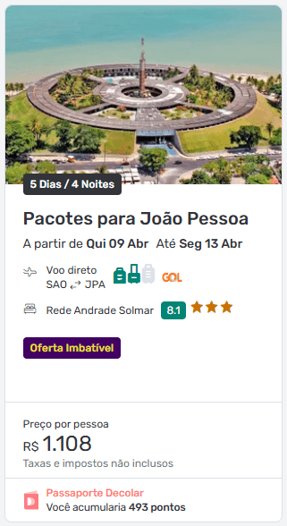 Pacote completo para João Pessoa por R$ 1.318 por pessoa (valor total R$ 2.636 para duas pessoas)