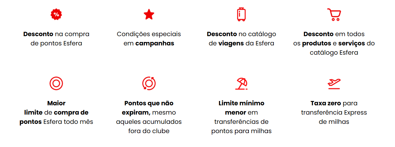 - Desconto na compra de pontos Esfera — variando conforme o plano, podendo chegar a 50%.