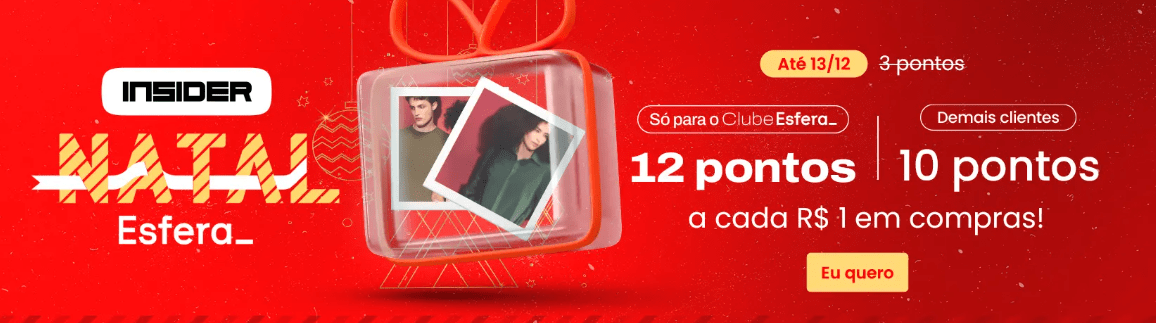 Clientes Clube Esfera: 12 pontos a cada R$ 1,00 compras no site parceiro (10 pontos a cada R$ 1,00 para demais clientes).