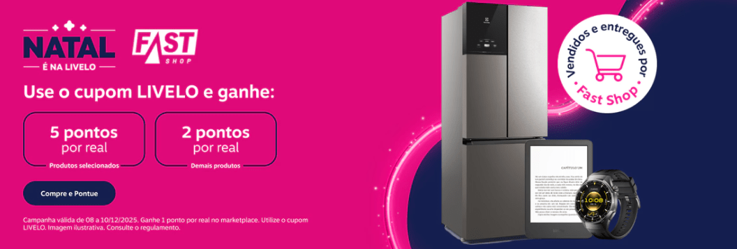 Fast Shop: 5 pontos por real gasto em produtos selecionados; 2 pontos por real nos demais itens e 1 ponto por real no marketplace.
