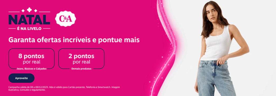 C&A: 8 pontos por real gasto nas categorias de jeans, básicos e calçados e 2 pontos por real nos demais produtos.