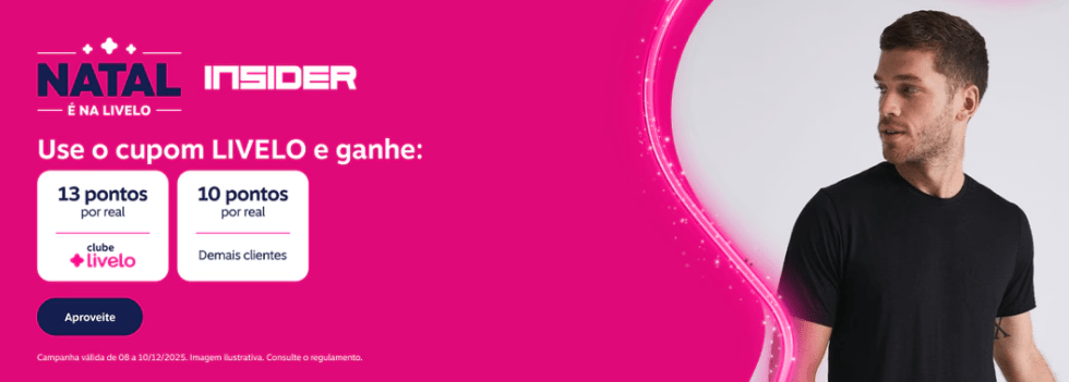 Insider: 13 pontos por real gasto exclusivo para assinantes Clube Livelo e 10 pontos por real para demais clientes.