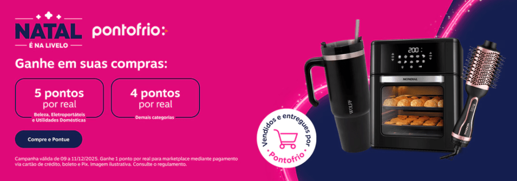 Ponto Frio: 5 pontos por real gasto nas categorias de beleza, eletroportáteis e utilidades domésticas; 4 pontos por real para demais produtos vendidos e entregues por Pontofrio e 1 ponto por real para marketplace mediante pagamento via cartão de crédito, boleto e Pix.