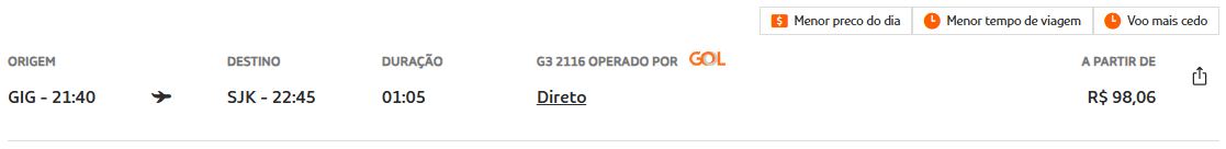 Do Rio de Janeiro (GIG) para São José dos Campos (SJK) a partir de R$ 98,06, com taxas inclusas.