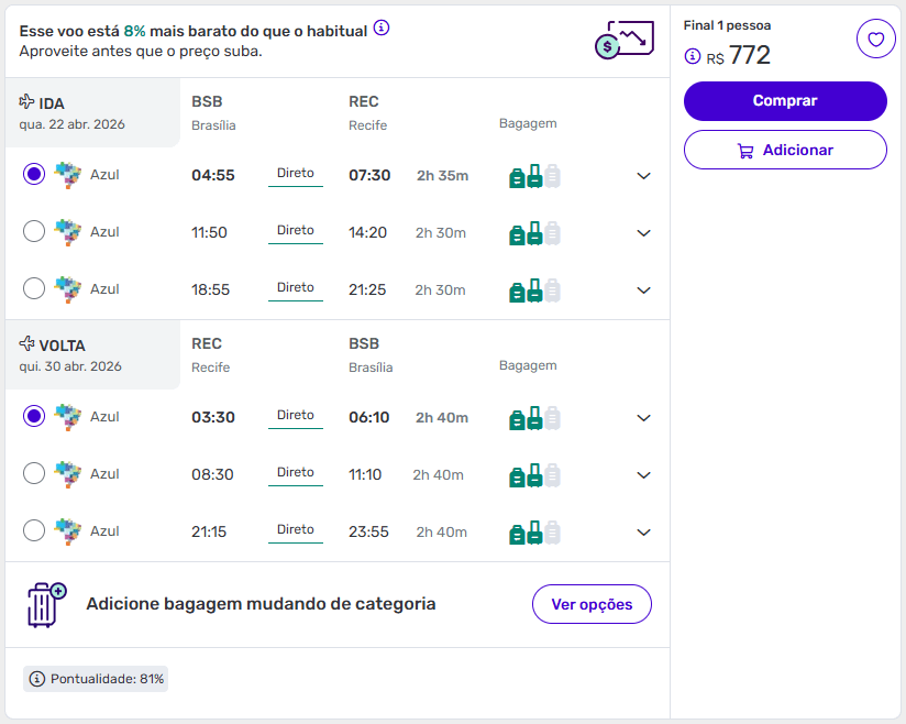 - Ida em 22 de abril de 2026 e volta em 30 de abril de 2026