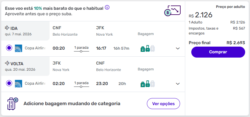 Belo Horizonte → Nova York a partir de R$ 2.693 (ida e volta, taxas inclusas) — até 10% abaixo do habitual