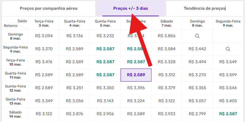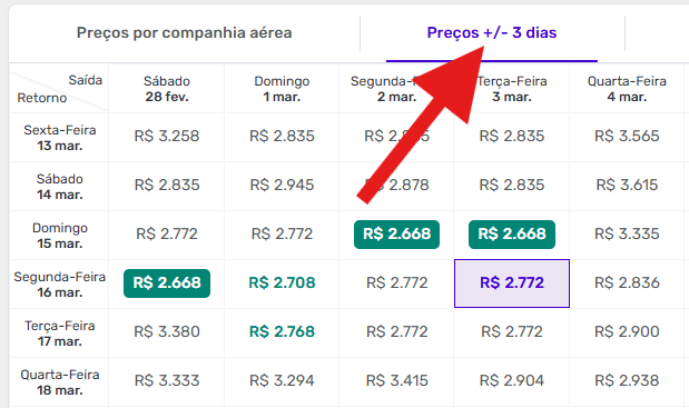 Lembre-se de clicar em “Preços +/- 3 dias” (imagem abaixo) para localizar outras datas com preços baixos!