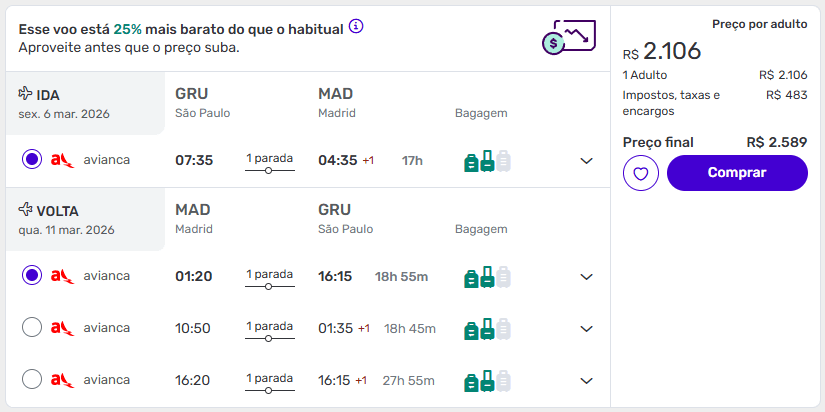 Na imagem acima do site da Decolar, podemos ver voos operados pela Avianca, saindo de São Paulo (GRU – Guarulhos) com destino a Madrid (MAD) a partir de R$ 2.589 ida e volta, preço final, com taxas inclusas.