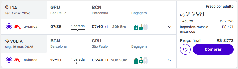 Na imagem: São Paulo (GRU – Guarulhos) / Barcelona (BCN) com a Avianca, por apenas R$ 2.772 ida e volta, preço final, com taxas inclusas.