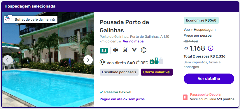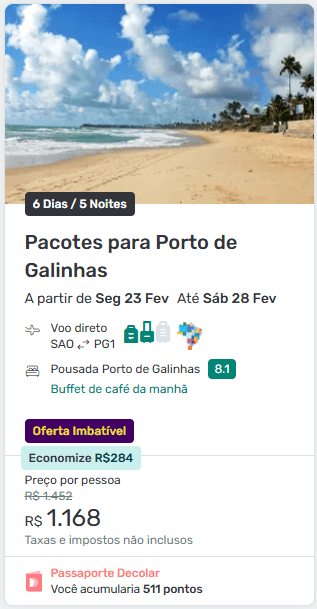 O pacote inclui voo para Recife (REC), que é o aeroporto mais próximo de Porto de Galinhas. A cidade fica a aproximadamente 60 km do aeroporto, com acesso rápido pela PE-009.
