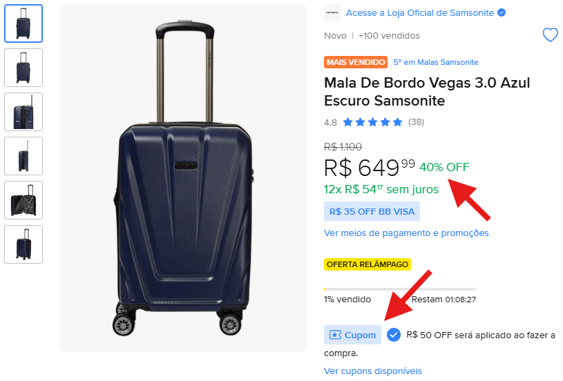 Mala de bordo Vegas 3.0 Samsonite de R$ 1.100 por R$ 649,99 (40% OFF), aplicando o cupom e indo para o pagando o total fica R$ 599,99!
