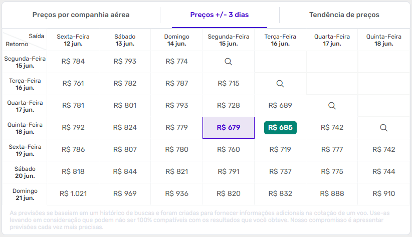 Como os preços variam conforme o dia da semana, a própria Decolar disponibiliza um calendário de preços, que exibe uma janela de três dias antes e depois da data selecionada, facilitando a comparação e a escolha da melhor tarifa.