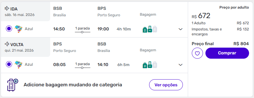 Brasília também entra na lista de ofertas disponíveis na Decolar para Porto Seguro. A ida ocorre em 16 de maio, com retorno em 21 de maio, em voos operados pela Azul, ambos com uma parada.