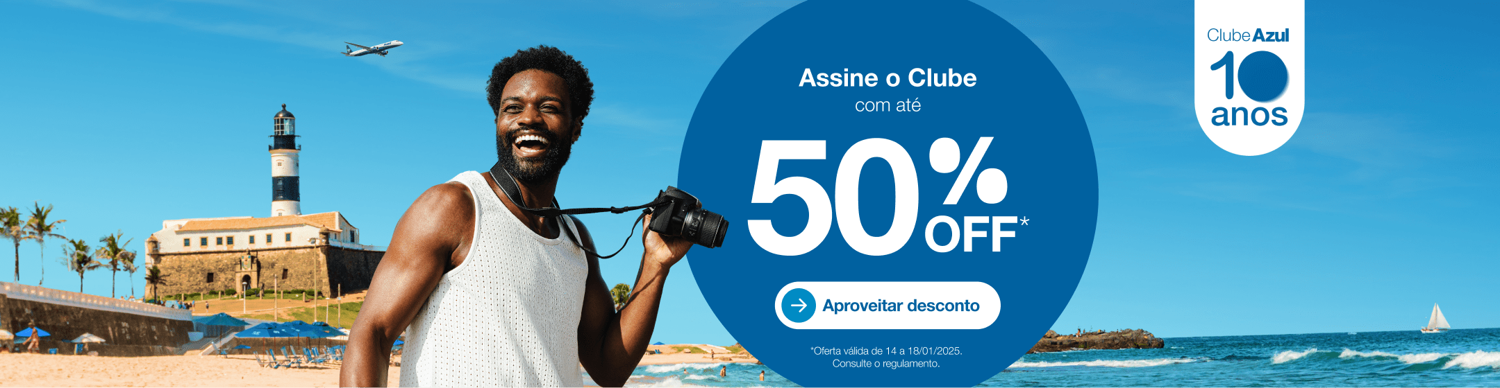 O Clube Azul, programa de assinatura do Azul Fidelidade, está celebrando seus 10 anos com uma campanha especial que oferece até 50% de desconto na assinatura. A promoção é válida até 18 de janeiro de 2026 e contempla tanto novos assinantes quanto clientes que desejam aderir aos planos anuais durante o período promocional.