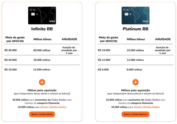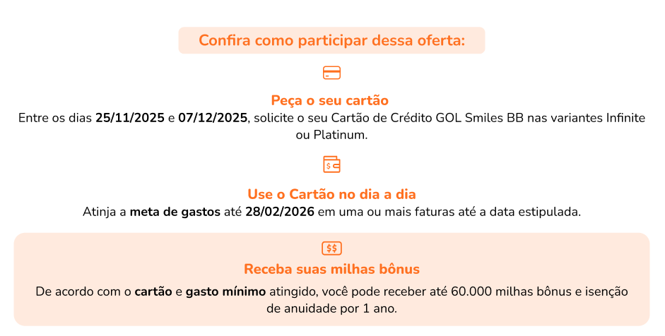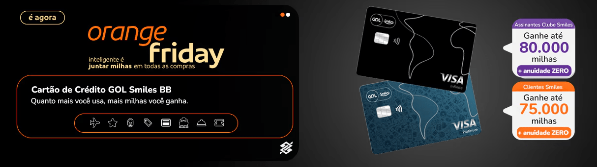 A Smiles iniciou uma campanha especial para novos clientes do Cartão de Crédito GOL Smiles BB, nas variantes Infinite e Platinum. A ação, válida entre 25 de novembro e 7 de dezembro de 2025, oferece até 80.000 milhas, benefícios extras e isenção da anuidade por um ano, mediante cumprimento das regras de gastos previstas no regulamento.