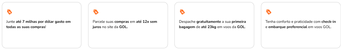 Além do acúmulo promocional, os cartões oferecem vantagens próprias da parceria GOL + Smiles. Entre os diferenciais disponíveis para clientes elegíveis ao Infinite e/ou ao Clube Smiles estão: