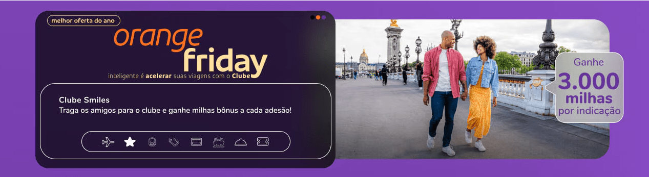 O Clube Smiles lançou uma ação promocional na Orange Friday que recompensa assinantes por convidarem amigos: a cada indicação que se transformar em assinatura do Clube, o indicador recebe 3.000 milhas bônus. Quem aceitar o convite e assinar também garante um superbônus de boas-vindas.