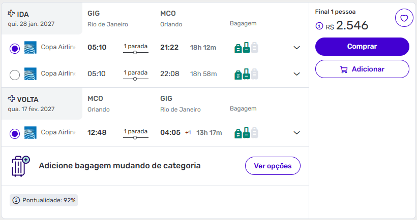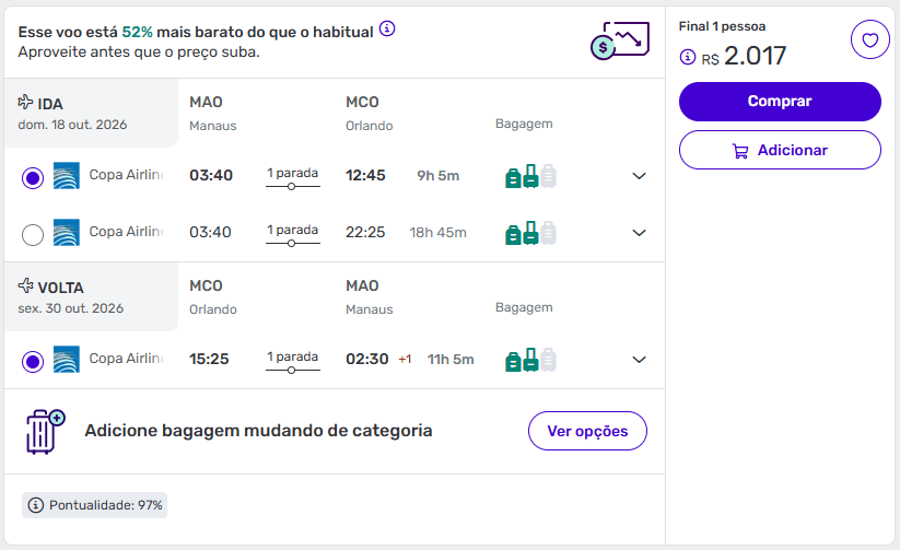 Mesmo sem percentual informado, o valor chama atenção — especialmente por ser alta temporada moderada nos EUA. São praticamente 20 dias de viagem, perfeitos para uma experiência completa, incluindo parques, compras e até bate-voltas.